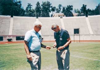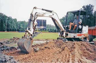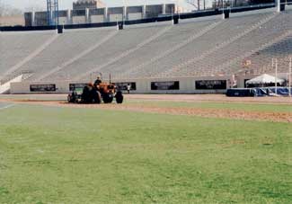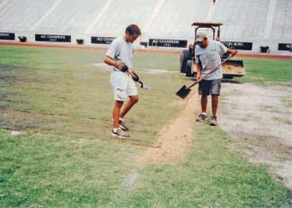 In 1997, the field surface of Tifton 57 hybrid Bermuda grass growing on native soil was renovated. The renovation consisted of a designed sub-surface drainage system, laser graded, ?EUR??,,????'??sand base?EUR??,,????'?? growing medium, automatic irrigation system and sprigged Tifway certified 419 hybrid Bermudagrass.