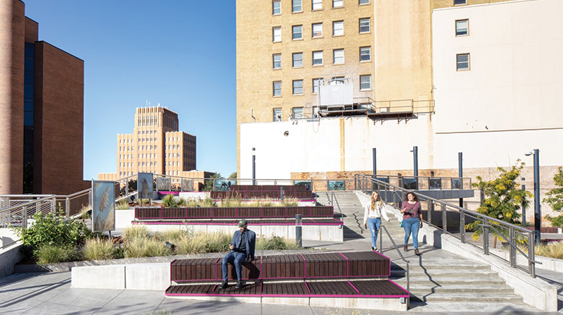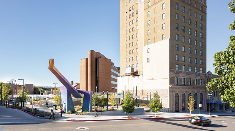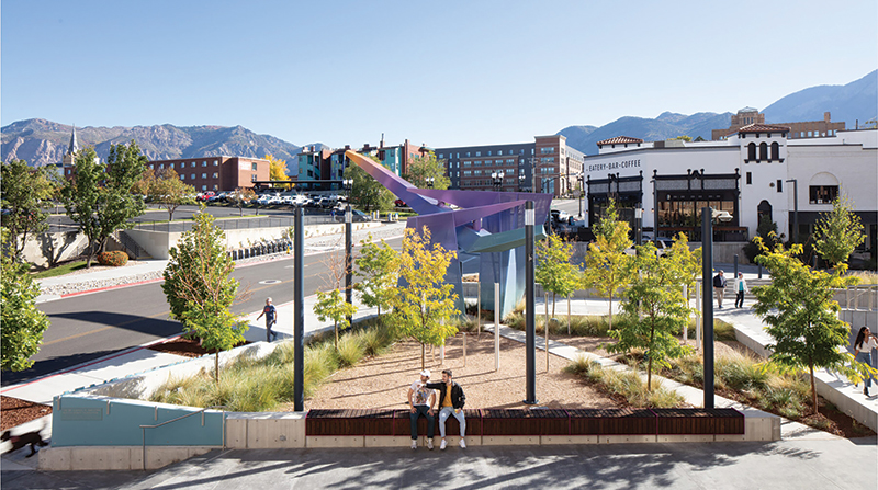 As a new civic hub anchoring downtown Ogden's creative district, Dumke Arts Plaza is a vibrant, multiuse public space that activates a once-abandoned half-acre site. Completed in 2022, the plaza occupies a corner of the Nine Rails Creative District, an emerging center for Ogden's arts community that includes galleries, performance spaces, studios and public art.