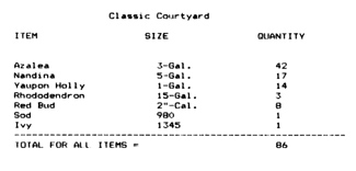 Once all of the items are changed into the text file, you are half way there. By the way, for this plan, the file was created in less than 2 minutes. Now that you have a file that contains basic “takeoff” information, Figure 2, item and quantity, the estimating system can begin by providing a list of materials and quantity of each material. Notice the drawing where it says “12 Yaupon Holly”. The computer corrected my error and in the material takeoff added two that I missed and inserted 14. The system counted the symbols and did not rely on the number printed beside the plant material. This is where this software package excels. With all the other programs you first must manually complete a materials takeoff. With EZ-ESTIMATE the takeoff is essentially being done as the designer selects materials during the design phase. This “networking” between drawing and estimate provides the accuracy and becomes invaluable to the overall estimating process.