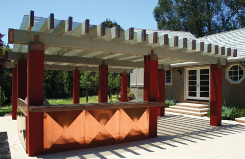 Underneath sits a dining table that adjoins a bar seating area. The L-shaped outdoor kitchen is constructed of copper sheeting, stucco and red recycled colored glass in cast concrete. The entertainment island doubles as a bar for seating that faces the cook and the views of the coastal hills beyond. The striking use of copper on two sides of the barbeque was inspired by interior designer Anne Munemitsu?EUR??,,????'?????<???EUR?s use of a pyramidal form on an entertainment wall in the family room. Robert Mowat Associates used this interesting shape for the inspiration of the barbeque wall treatment. Mowat explains, ?EUR??,,????'?????<?Copper is soft against the knees of the guests and engages the eye in an elegant expression of the material.?EUR??,,????'?????<?