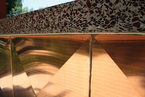 The cast concrete countertop with red recycled glass chips has a rectangular slot for keeping wine and drinks chilled on ice for quick access. Stainless steel storage cabinets, refrigerator, barbeque and a copper sink round out the amenities on the outdoor kitchen.