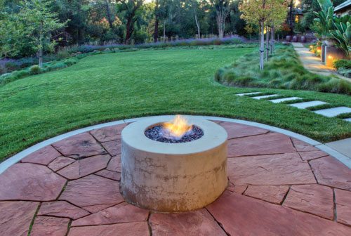 Fire Pit Los Altos Hills rarely finds itself enshrouded in San Francisco?EUR??,,????'?????<???EUR?s symbolic mist. Though on occasion, the nearby ocean?EUR??,,????'?????<???EUR?s fog does round over the mountains into the small valley cooling temperatures. For such instances, the team built a cast concrete fire pit filled with colored glass in order to encourage guests to cozy up. Surrounded by red flagstone the space sets the stage for overlooking the gardens, which gently sweep down from the upper patio. Another fire bowl, located off the master bedroom, punctuates the private patio and is a foreground element for the rhythmic fountain elements. Woon Lee affirms, ?EUR??,,????'?????<?We would have never thought to include fire pits but have found family and friends huddled around them on chilly nights.?EUR??,,????'?????<?