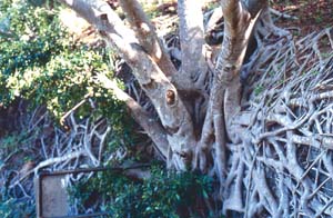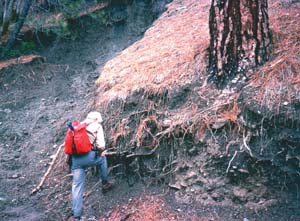As noted in Table 1 the benefits of vegetation greatly outweigh detrimental effects. The most obvious way in which woody vegetation enhances mass stability is via root reinforcement. Extensive laboratory studies on fiber reinforced sands indicate that small amounts of fiber can provide substantial increases in shear strength. These findings have been corroborated by field tests on root permeated soils.Soil buttressing and arching action associated with roots and the stems/ trunks of woody vegetation are also important components of slope stabilization (see Figures 1 and 2). In addition, evapo-transpiration by vegetation extracts soil moisture and increases storage capacity. This means that vegetated slopes can tolerate greater inputs of water before exceeding field capacity and developing positive pore water pressures within the soil mantle. Lower pore water pressures increase stability and resistance to slope failures.