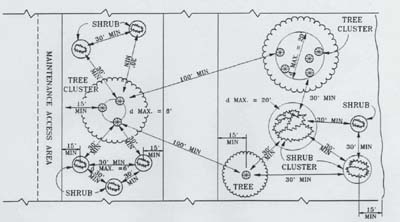 Several different placement or locational strategies can be invoked to maximize the utility of slope plantings and minimize possible problems. One of the main objections raised to vegetation on slopes is that it obstructs views and hinders access. These objections have been raised by both homeowners living on hillsides and inspectors examining river levees. These problems can be addressed by pruning and coppicing techniques which are described in the next section. They can also be addressed by placement of vegetation on a slope according to its height and shape or density of the foliage crown. Smaller shrubs should be grown near the top of slope and larger trees placed near the bottom. This simple procedure will not only improve views from the top, but also eliminate weight from the top of the slope, and put maximum buttressing restraint and reinforcement near the base where it is most needed. In the case of river levees plants can be located in such a way to meet both stabilization objectives and to create relatively clear fields of view for inspection and access purposes (see Figure 6).