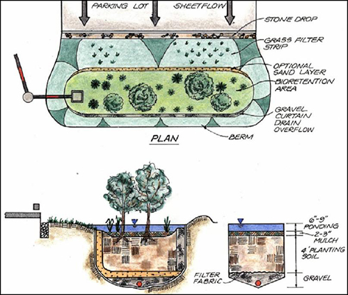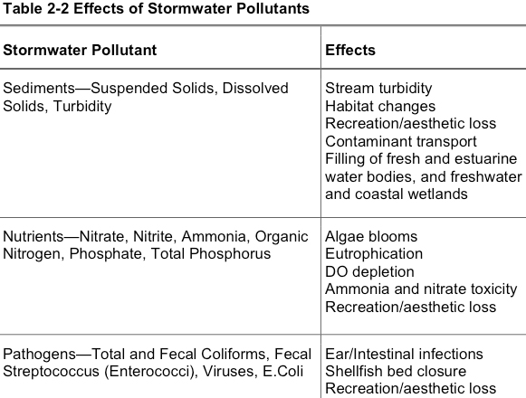 The new stormwater manual notes: ''Traditionally, stormwater has been managed using large, structural practices installed at the downstream end of development sites, often as an afterthought, on land segments leftover after developing property. Stormwater is typically conveyed from rooftop to driveway to street, where it is then quickly conveyed via a drainage system to a downstream structural practice such as a dry detention pond. This approach, sometimes referred to as end-of-pipe management, yields the apparent advantages of centralizing control and limiting expenditure of land. These structural drainage systems are designed to be hydraulically efficient for removing stormwater from a site as fast as possible. However, in doing so, these systems limit groundwater recharge, can degrade water quality of receiving waters, and increase runoff volumes, peak discharges, and flow velocities.