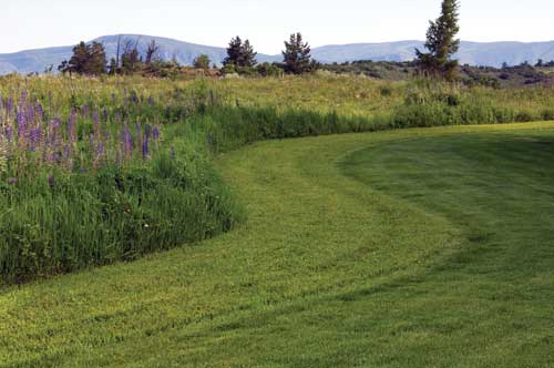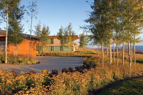 The planting design was envisioned to maximize the transparency of the residence and create a landscape that appears endless. This was achieved through artistic forms and bold, colorful plantings that preserve views and correlate to the scale of the residence and its larger context. Native plants, including sagebrush, red-twig dogwood (Cornus), black-eyed Susan (Rudbeckia), purple coneflower (Echinacea), alpine lupine (Lupinus) and periwinkle (Vinca) transition the contained landscape to the natural surroundings. The lawn, which immediately surrounds the residence, is also layered through a series of mowing heights. Strategically-placed quaking aspens appear as natural sculptures set into the landscape, framing views to distant points of interest.