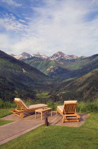 The client requested a design to accommodate both small and large gatherings of family and friends. A stone-lined outdoor dining terrace is used as the primary gathering space for smaller groups, while an expansive lawn offers the opportunity to accommodate larger crowds. Minimal intervention to the front lawn makes available one of the most dramatic Rocky Mountain views in central Colorado. Extending west from the terrace, a linear path leads guests to a promontory, where a seating area is elevated above the adjacent valley to celebrate the dramatic vistas.