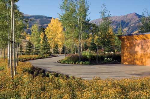 A ?EUR??,,????'?????<?Subtle?EUR??,,????'?????<? Entrance The home?EUR??,,????'?????<???EUR?s entrance and driveway is oriented to Mt. Sopris to the west and meanders through a field of preserved sage and rehabilitated native grass meadow, allowing the residence to appear nestled in its natural surroundings. The entrance drive leads guests to a circular arrival court that terminates under the residence?EUR??,,????'?????<???EUR?s 40-ft. cantilevered, porte coch???????oere. Stone outcroppings, softened with contrasting, creeping groundcover, delineate the limits of the vehicular surface. The hand-seeded, exposed aggregate concrete drive is accented with polished concrete bands.