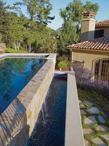 To put the plan in motion, Robert Mowat Associates sculpted and carved out the hillside. The team created four separate patio levels centered on a two-sided fireplace and dramatic invisible-edge pool. The pools and patio take full advantage of the impressive views of the hills. From above, the pool creates a dramatic invisible edge that carries over into a kinetic wall of water to offer relaxing, ambient sound. After selecting the design, the landscape architects quickly collaborated with a structural engineer to ensure the cut slope of the design did not disturb a neighbor's higher elevated pool, situated a mere five feet from the property line. The timing of the new retaining wall construction and pool would have to be done quickly and in the dry season, with no chance of land subsidence. A separate consulting engineer ascertained a six-foot cut into the slope and a new pool would not affect the neighboring pool's foundation or create any future unwanted settlement.