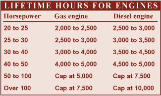 As a general rule, I like to project lifetime hours for gas engines at 100 hours of life per horsepower. Diesel engines I project at 125 hours of life per horsepower. However, I’ll cap lifetime hours for equipment as indicated in Table 9.1.