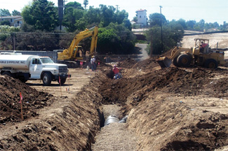Gabion wall: A wall constructed of baskets (usually made of wire) filled with rock or broken pieces of concrete, used for erosion control.