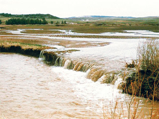Headcutting: The action of an upstream moving waterfall or locally steep channel bottom with rapidly flowing water through an otherwise placid stream. These conditions often indicate that a readjustment of a stream’s discharge and sediment load characteristics is taking place.