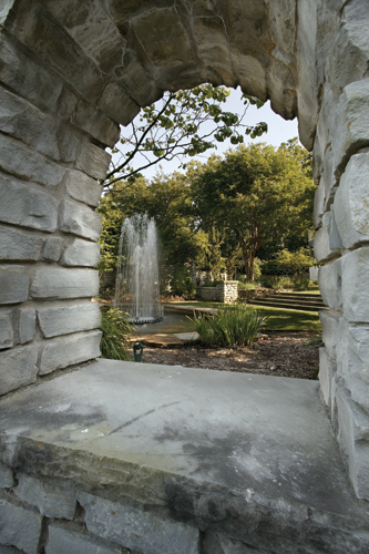 Extensive landscape borders edged in thin native fieldstone surround the beautifully manicured zoysia lawn. The garden beds have cultivars of Japanese maples, hollies, "Little Gem' and "Hasse' magnolias, plus numerous herbaceous perennials, annuals, bulbs and grasses. Descending the broad stairs at the far side of the grand lawn one enters the sunken garden, the location of the display fountain, which was also used as a wadding pool when the client's children were young. The small washed and smooth black aggregate ("Pebble Tech') provides a smooth and durable finished pool, creating an illusion of depth; the large flagstone edge is in shades of tan and browns. The large arched window in the back provides a seat and a view into the vast garden beyond. A large arched doorway in one of the walls invites the visitor into the first of several smaller intimate garden rooms. At the bottom of and to the right of the arched stairway is a stunning specimen "Lusterleaf' holly. Across the small patch of lawn in another edged landscape bed is a "Lipan' crape myrtle. Decorative hand-forged stainless steel garden panels separate the room from the adjoining courtyard.