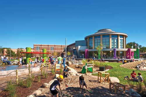 Transforming the Campus Confluence, a regional landscape architecture firm, was brought on to help program and lead the exterior design effort for the 3.45-acre site, including 1.5 acres of exterior exhibit space and the adjacent streetscape improvements. "Nature Play" was a unified theme of the outdoor exhibit space. Confluence worked closely with the owner and exhibit design consultants to develop a site plan that reflected the unique goals of the project. The site exhibit space includes an interactive stream and fountain, dig pits, a rolling hill and tunnel, a "mud pie kitchen", stacking and climbing elements, a maze, a winter skate pond, and a large equipment display area as well as the only full size, permanent animatronic tyrannosaurus rex in the United States.