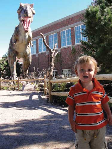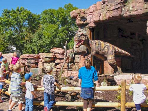 Streamside A recirculating stream with a gravel bottom, step stones and bridged crossings gives children the opportunity to build a beaver dam or test their balance wading across logs and stones. Design elements in this area include a stamped animal print colored concrete surfacing, ornamental metal perimeter fence with masonry piers and rustic branch fencing. Living Maze Prairie grasses form the edges of the maze, which has a gravel pathway that leads to a central gathering point. Hiding among the grasses are butterflies and native plantings that children can learn to identify. Design elements include crushed limestone surfacing pathways, fieldstone boulders, custom bug condos, bird and butterfly houses, quartzite splash basins, exhibit signage, spaces for future sculptures and pedestrian light poles. Dino Dig At Dino Dig Plaza children can explore the fields of paleontology and archeology by conducting their own excavations within the three sand pits and two prairie berms. They can unearth dinosaur bones that could be found on a South Dakota farm. Design elements include a stacked quartzite retaining wall, accessible dig table, fieldstone boulder outcroppings, stamped animal print colored concrete surfacing, ornamental metal perimeter fence with masonry piers, post and rail fencing, salvaged existing shelter, boardwalk, educational displays, dino cave with a vegetated background. Meet Mama & Max Mama and Max, the only full-size, permanent, animatronic tyrannosaurus dinosaurs in the United States, roar during the spring and summer months, or as long as the weather permits. Mama stands 25 feet tall and 60 feet long, while her juvenile son Max is about 7 feet tall with feathers, as research has shown this is what he would look like at this stage in his life. Design Elements in this area include a post and rail fence, crushed limestone surface walkways, quartzite boulders and tree trunks/branches.