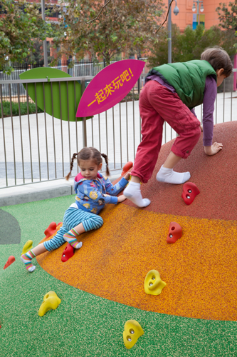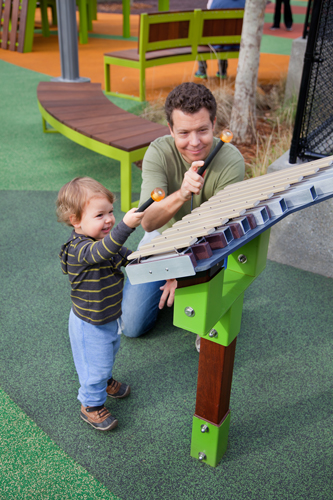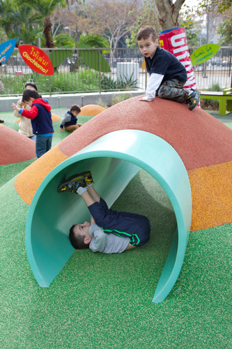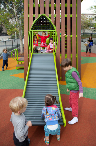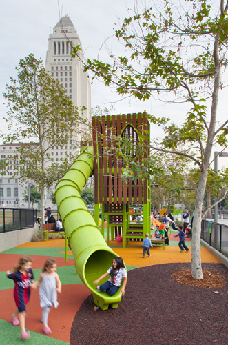 Los Angeles-based landscape architecture firm Rios Clementi Hale Studios had the design challenge of expressing the multicultural diversity of the City of Angels in its design for Grand Park in downtown Los Angeles. The 12-acre park resides between the Music Center and City Hall. Faced with a site divided by two city streets and a challenging 90-foot grade change, the landscape architects softened Bunker Hill's incline with pedestrian-friendly and ADA-accessible ramps and broad steps. "J-Ramps" extended existing below-grade ramps to the north and south to create a series of central terraces (dining, event seating, general gathering places) with drought-tolerant plants and a grand event lawn, all leading down into the park from Grand Avenue to the restored Arthur J. Will Memorial Fountain. The park opened to acclaim in 2012. In November 2014, the park got a new playground. Located at the east end of the park between Broadway and Spring Street, the playground is a fanciful forest for youngsters to experience an urban style tree house, slides, a rock climber and more. Rios Clementi Hale Studios designed the playground, a collaborative effort of firm memebers Tony Paradowski, senior associate, John Stuart Fishback, landscape architect and associate and designer Chris Torres. At the heart of the 3,500 square foot playground is a tree house inspired steel frame structure painted lime green, with Brazilian ipe hardwood slates. The custom play structure by Lexington Design + Fabrication has an impressive 12-foot tall tube slide jutting from the side of the tree house; for the smaller kids, there's a four-foot high roller ramp at the other end. "We researched city playgrounds from all around the world, especially in Europe," explained lead designer Tony Paradowski of Rios Clementi Hale Studios. "The tower design gives children a sense of what it's like to climb a tree in an urban forest." The playground's safety surfacing offers a "forest floor' of larger-than-life leaf shapes in a variety of nature-inspired colors. "The leaves are placed in a random pattern to appear as if they've been blown off the trees," says Paradowski. "We wanted kids to feel like they're playing in a mound of fallen leaves." As the mature sycamore trees placed in the playground grow, their boughs will eventually connect together to create a continuous shade canopy. Seven berms ranging from one to four feet tall have added features, such as rock-climbing handles, a rope climber and a tunnel constructed of a reclaimed storm drainpipe. Two types of safety surfacing were used in the design of the playground: poured-in-place and bonded rubber fiber, or recycled rubber mulch. A two-part system created an underlying cushion layer sized to accommodate various fall height requirements throughout the site, and an outerwear course. Where trees were planted within the play zone, bonded rubber fiber was installed to simultaneously provide fall protection and maintain tree health by using a material that promotes airflow and water penetration to the root ball. Both products were made and installed by Spectraturf. For parents and care givers, there are several curved steel-framed benches painted the same lime-green as the play house, along with Brazilian ipe slates for good looks and sitting comfort. Another feature of the playground is the colorful, leaf-shaped signage by Rios Clementi Hale Studios. Decorative signs on the three-and-a-half foot tall fence that surrounds the playground have the words "Let's Play" in 25 different languages, which come from the Los Angeles County voter registration materials. Play equipment by Lexington Design + Fabrication and Landscape Structures includes: • A custom 20-foot-high tree house • Four-foot-tall roller slide • A 12-foot-tall tube slide • Three tiers of platforms inside the climber • Rope climber • A crawl tunnel • Rock-climbing handles • Play mounds ranging in height from one to four feet in height Note: The three xylophones are from Freenotes Harmony Park, Durango, Colo. One challenge of the project was creating a design that was exclusive to Grand Park, but stayed within the budget. The designers collaborated with a local fabricator to create a custom tree house climber that would also bring a sense of nature into the urban site. The infrastructural expenses to retrofit the site for a playground ended up being significant, despite efforts to minimize impact to existing conditions. These constraints led to a smaller footprint than initially expected and led the design team to maximize play opportunities within the 3,500-square-foot linear space. The playground, like all of Grand Park, is ADA accessible.