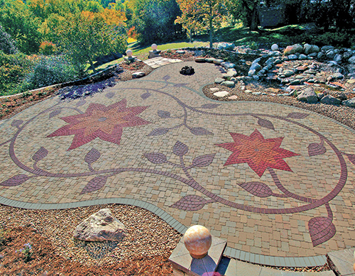The contractors used Techniseal polymeric sand to stabilize paver joints, while paver enhancer was used on the flowers, vines and leaves for added surface protection. 12-inch galvanized spikes were installed as the border restraint. A pond was built with three waterfalls, complete with boulders in front and multi-colored LED lights on a color wheel beneath the falls. ''It's a pretty cool place at night with the lights in the falls and the colors reflecting off of the spheres. Wild turkey and deer wander out onto the patio in the evenings,'' declared Justin Hampton.
