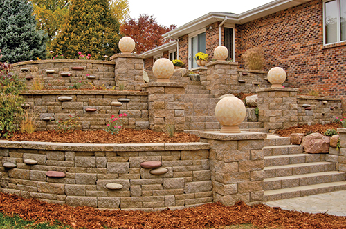 The 3-tiered retaining walls built into the steep hillside were constructed of a 3- and 6-inch limestone-colored Anchor Highland Stone Free-Standing Wall System. Flat river stones were cut in half and glued into 1-inch deep pockets chiseled from random blocks.