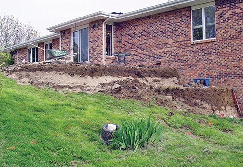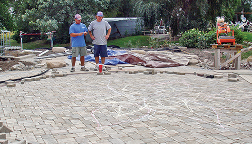 Jim and Justin Hampton began by laying out the patio's shape. The contractors installed a base consisting of 162 tons of crushed, recycled concrete. This was done to raise the patio approximately three feet on one end where the yard sloped steeply.