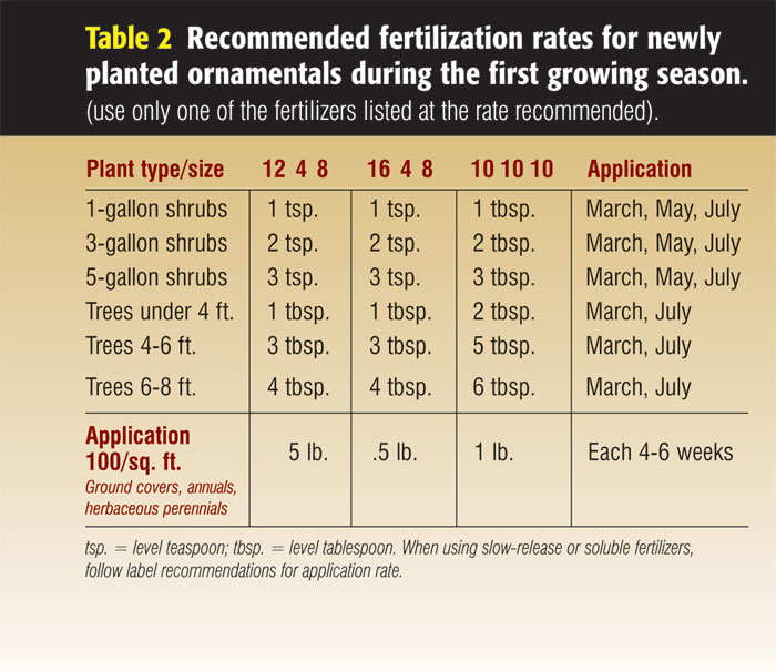 Newly-planted ornamental trees and shrubs benefit from light applications of fertilizer made during the first growing season after transplanting (Table 2). Broadcast the fertilizer uniformly along the perimeter of the planting hole. Newly planted ornamentals are under stress and can be easily injured by overfertilization. Also, don?EUR??,,????'???t use weed-and-feed fertilizers in the vicinity as the herbicide may do damage.