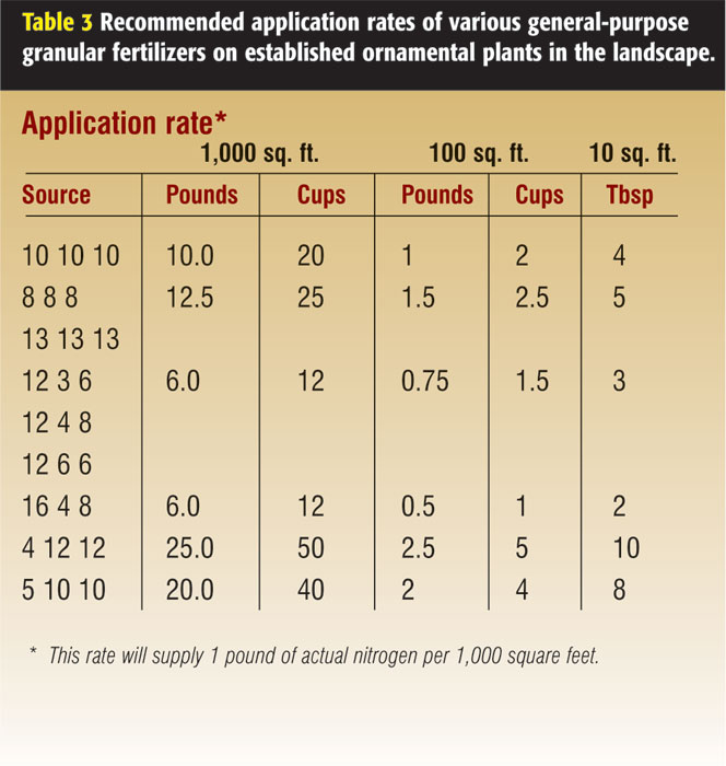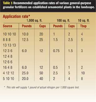 Nitrogen controls plant growth, so application rates are based on this primary nutrient. Table 3 lists suggested application rates for several general-purpose fertilizers.