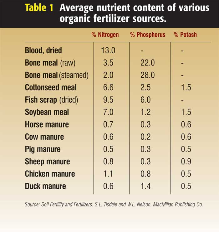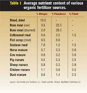 You may prefer composting or organic fertilizers (bone meal, cottonseed meal, manures). Table 1 lists the average nutrient content of several organic fertilizer sources.
