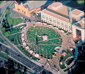 As a gathering place for festivals and other patriotic events, Festival Plaza has an air of sophistication that is welcoming to the public. The plaza is located in the cultural arts center of Ottawa, Ontario. Located to the east is the old, historic armory and directly across the street is a large public park and a clustering of theaters and opera houses. Periodically throughout the year, the plaza serves as a gathering place for special events including the highly anticipated, annual ice sculpture competition during winter carnival.