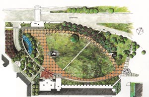 Griffiths explained that the decision to use curving forms stemmed from a desire to create a sense of enclosure. "By designing the plaza with a curved form, we wanted to make the space inviting and informal," he related. "We believed that the right angles and straight lines of the building and parking structure would be softened by the curved design of the plaza."
