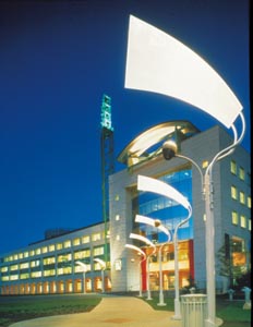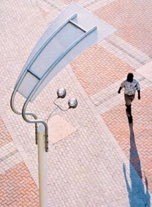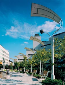 Once the curvilinear design for the plaza was decided upon, the architectural team turned to lighting designer Philip Gabriel, IALD, to develop the sweeping light fixtures for the space. The 27 light fixtures that line the curved pedestrian path utilized the traditional concept of indirect lighting and applied it to an outdoor venue. Gabriel said he drew inspiration from similar light fixtures designed by Finnish architect Alvar Aalto in the late 1930s that are still in place today. In addition, a smaller version of the indirect light fixture was designed for the 1967 World's Fair in Montreal. These two examples allowed Gabriel to conceptualize the indirect light fixtures that bounce 150-watt metal halide lights off a perforated metal screen to create a soft and inviting glow in the plaza.
