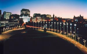 In addition to the 27 indirect light fixtures that line the curved path, two double-headed fixtures illuminate the plaza's entrance. Tall flag poles that proudly display the flag of each municipality in Ontario also curve along the path opposite the light fixtures. High atop each pole sits a bright, white light. "These flag poles contrast beautifully with the reflective lights on the lower level," Griffith exuded. The two curves play against each other in a very dynamic way."