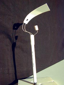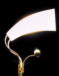 Once the general structure of the light fixtures was determined, it was time to hammer out the details. In Gabriel's studio, they experimented with the 150-watt metal halide Par lamp. The task at hand was to develop the shape for the "sails" and determine the approximate height and angle of the fixture. By shining the rectangular-shaped beam onto a curved piece of white cardboard, Gabriel was able to trace the edge of the light beam as it bounced off the paper. The shape that the beam of light made on the paper served as the model for the perforated metal "sails".