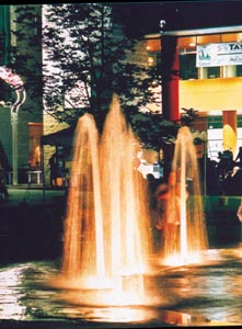 To solve the problem of hot-spots on the perforated metal "sails", Gabriel experimented with a number of filters designed to disperse the light evenly. By adding filters to the light fixtures, a wealth of creative opportunity has followed. For example, when a Chinese festival was held at the plaza, the entire plaza was turned red through the application of theatrical filters. Through the addition of a small, inexpensive filter, the entire ambiance of the plaza can be changed. The possibilities are truly limitless.