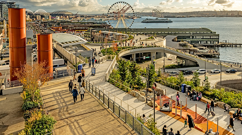 On September 6, 2025, the City of Seattle is celebrating the Grand Opening of its new 20-acre Waterfront Park, designed by Field Operations. This landmark project heralds an amazing transformation of what used to be an elevated viaduct highway into a new public promenade, with bike lanes, event piers, gardens, beaches and new connections from downtown to the magnificent waterfront of Elliott Bay. The waterfront is now Seattle's new "Front Porch," supporting public access, civic programs and events, health and wellbeing, bio-diverse habitat and new experiences - all set within the context of breath-taking vistas and prospects across the Bay and back to the city. Seattle's Waterfront Park extends 26 blocks, from historic Pioneer Square to Belltown, and reconnects downtown, Pike Place Market and various neighborhoods to the Bay. The dramatic Overlook Walk reconnects Pike Place Market to the Seattle Aquarium, Piers 58 and 62, and the Historic Commercial Piers along the waterfront. The overlook also provides some of the most iconic elevated vistas looking out and across the Bay and back to the city. After 15 years of careful planning, design and construction, with over $800M investment, the City and Field Operations delivered an ambitious vision developed with our partners at Jacobs Engineering, WSP, HNTB and many others, including key stakeholders, community groups and indigenous Tribal representatives. Field Operations was commissioned by the city in 2010 as the Masterplan, Urban Design and Landscape Architecture Lead, working closely with the Community and various Agencies to develop the Guiding Principles, Art Plan, Framework Plan, Concept Design and Detailed Construction Documentation. This includes 8 distinct projects built in a sequence of phases:
