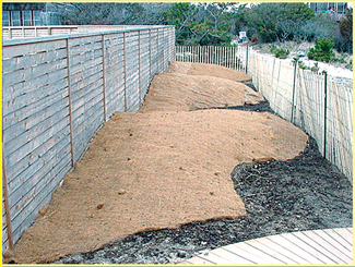 In anticipation of the period of time between grading and planting, approximately 5,000 square feet of photosynthetic, biodegradable geotextile, was installed and pinned down with sod staples to prevent wind erosion. Woven coir mat was selected for its material composition and measured lifetime, which would coincide with the time when the plants were well rooted.