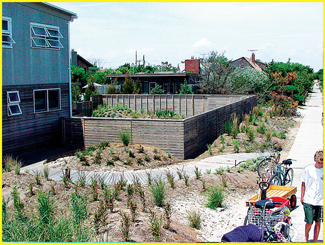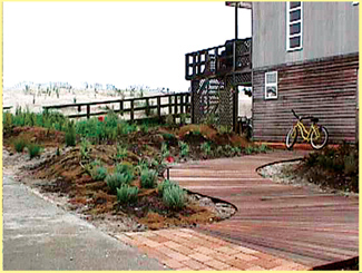 The clearance between the structures and existing grade ranged from four to 18 inches. However, this basic grading requirement quickly developed into a more holistic treatment that became a thematic extension of the seaside dunescape.