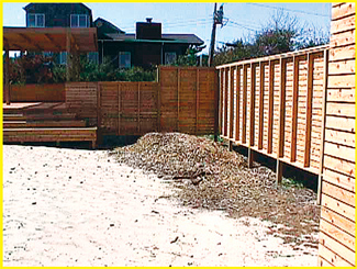 To protect the existing fence from deterioration due to contact with the mounded dunes, thick marine?EUR??,,????'???grade plywood was attached to both sides of the fence frame, and then cut to conform to the dunes?EUR??,,????'??? profiles.
