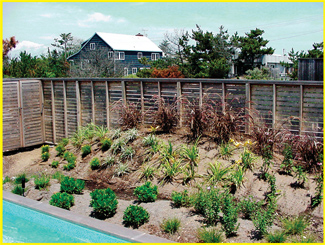 During spring, a multi-zone pop-up irrigation system, tailored to the idiosyncratic water pressure on Fire Island, was installed along with a rustic flagstone walkway winding around the garden dunes. The irrigation system was installed at the base of the graded dunes, with piping running under the walkway. The result of a unique design and execution, built literally and thematically on the graded dunes is a wonderful garden retreat that would be tempting to even the most ardent beach lover.