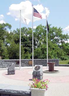 This project was initiated by the North Aurora Veterans Memorial Committee to honor village residents who have served in the military. The plaza is a 60-foot diameter site, with a water feature in the center and a curved monument wall inset into an existing landscape berm. Five stone pedestals in a semicircular pattern are placed around a small fountain that is a setting for quiet reflection and tranquility. Atop each pedestal is a bronze emblem of one branch of the armed services.
