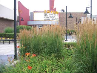 Taubman Co. retained DLK to help renovate a mall plaza that was a large roof space. The weight of the materials had to be kept to a minimum. A pedestal system of 30”x30” pavers dispersed the weight across the roof deck and provided space for installing lighting conduit, drainage and irrigation piping. Styrofoam and soil-less mixes form topography in the planting beds. Sweeping lines of plants complement the two separate paver fields. Boxwood hedges continue the curvilinear lines through the six-inch curbed beds. Blue fescue and perennials add color in summer; ornamental grasses provide fall and winter interest. Benches add comfort to the space; waste receptacles and ash urns help keep things tidy. Ornamental pedestrian lights provide ambience and security. The project is an engaging, cost effective, functional amenity for the mall.