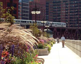 The improvements to the bi-level roadway in Chicago’s CBD, constructed in 1926, are consistent with modern traffic and engineering standards. Design work included a new post-tensioned structure for the upper roadway; re-alignment and reconstruction of the lower roadway, maintaining the caisson array; sidewalk replacement and widening; improved lighting (historic roadway and pedestrian fixtures); preservation and enhancement of historic limestone structures; upper plaza fountain and kiosk design; median planter design; sidewalk planter design; and establishing hybrid seasonal rotation planting schemes. Improved access and safety, easing traffic flow on adjacent streets, enhancing the streetscape and future development of a Riverwalk were achieved. The project earned an AIA Chicago Honor Award and IL ASLA President’s Award in 2005.
