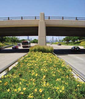 Hundreds of trees were inventoried in the median and adjacent parkways to assess the impact of the roadway reconstruction on their health. The median landscape concept was a “pulse,” using waves of plantings—nearly 1,200 new trees and tens of thousands of salt-tolerant shrubs, groundcovers, vines, perennials and bulbs. The landscape near the bridges is “more organized” to reflect the architecture. An automatic irrigation system was designed and installed for the median. A series of pumping and control stations run the length of the project. The irrigation system helps flush salts that accumulate in the plantings during the winter months.