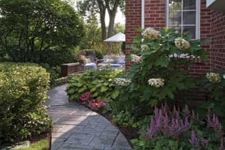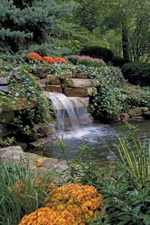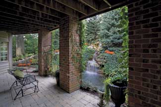 A mountain retreat in Colo. served as the vision for this Illinois home. A meandering stream cascades into a pool. The stream flows along the entire front landscape. The placements of natural stone bridges are pathways across the water feature.