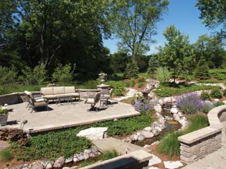 The firm’s work includes patios, driveways, walks, brick and natural stone, retaining and seatwalls, columns, plantings, native plantings, rain gardens, permeable paving, residential golf greens, outdoor lighting, custom water features, outdoor rooms, outdoor fireplaces, firepits and kitchens. The firm also does residential and commercial maintenance, as well as commercial snowplowing.
