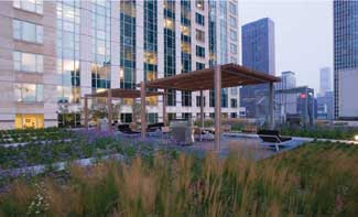 Ten floors above Michigan Avenue, condominium residents retreat to nearly 14,000 square feet of luxurious green, flowering landscape with spacious areas to entertain, grill out or simply unwind while absorbing dramatic views of Chicago’s exquisite skyline. Its environmental benefits blend with design qualities expected of a high-end amenity and changes what urban dwellers can expect from their city views. Height variety in plant material presents an unfolding experience from within the garden and creates shadow and depth throughout the seasons when viewed from above.