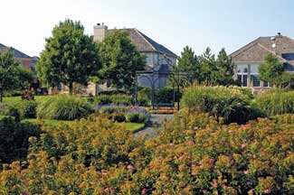 he design/build vision for this 50-acre gated community was a unifying landscape for the 151 home sites, but allowing a bit of individuality through a varied plant palette. Privacy between homes and screenings were prime objectives. The site required extensive soil amendments. A network of streams and ponds contain runoff and provide focal points. The waterways offer native aquatics and a mix of wildflowers for aesthetic erosion control. A windy corridor was dissipated by an 8-ft. high rolling berm. A barrier of 10-ft. tall evergreens on the berm further protects the site.