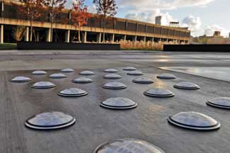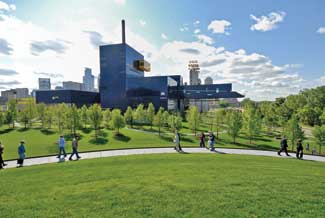 Gold Medal Park is in the historic Minneapolis Mill District, sited on 7.5 acres immediately adjacent to the Mississippi River and Jean Nouvel’s Guthrie Theatre. This park brought much needed public open space to the river area and is the city’s first public/private partnership in establishing legacy green spaces. The design intention was an unprogrammed recreational space for myriad uses. There are places for sitting in the sun or shade, eating lunch, throwing a football or a Frisbee, or taking in the views. There are close to 300 hand-chosen mature trees, 6" to 12" in. dia. A sculptural observation mound—32 feet in high and 350 feet wide—has a bosque of Amur maples and seating at the apex. A spiral walkway, bound in Cor-ten steel, allows ascent to the top. From this height there are great views of the river, the Stone Arch Bridge and the skylines of the Twin Cities. The observation mound was also the solution for the on-site environmental remediation by encapsulating the contaminated soils left from the historic land uses. The site furnishings, custom-designed by Oslund and Assoc., include LED-lit Ipe benches, pedestrian pole lights using W-section steel members, Ipe enclosures for utility screening and trash receptacles.