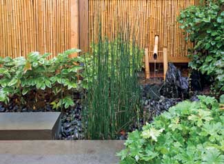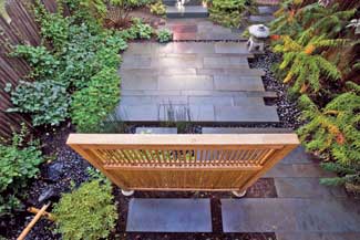 To fulfill the owner’s desire for a Japanese inspired garden, an urban oasis was created through the use of plants rich in texture and linear bluestone slabs designed as a contemporary abstraction of traditional Japanese forms. The deck was renovated with the use of bamboo to provide a cohesive design for the landscape and the spacing of the bamboo was creatively used to control views and light.