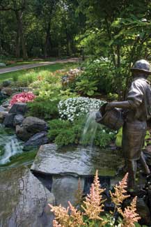 The challenge here was to reclaim a large portion of this historic landscape from the encroaching woodland. Understory trees and shrubs were removed by hand in order to protect the root systems of the mature oaks. The original rock-lined watercourse dating from the 1930s was restored and enhanced with deer-resistant shrubs and perennials. A flagstone path with bridges was added to provide easy access to the woodland garden. Visitors are greeted at the end of the native plant edged driveway by a water feature whose bronze sculpture represents the owner as a small boy catching frogs.