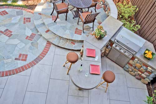 Residence, La Costa The clients of this newly constructed residence with golf course and distant hill views requested an outdoor entertainment area with seating, built-in barbecue, serving counter and a fountain. Livingston designed paving that leads guests from the formal dining room through an outdoor living room to a raised circular dining area. Adjacent is a built-in barbecue station with a generous serving counter. A seatwall surrounds the dining area to expand seating capacity in a small area. Accent paving highlights an on-grade seating area focusing on a craftsman-style fountain at the opposite end of the yard.