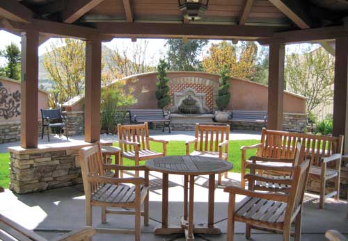 Casa Retirement Community Park, San Diego This small private park caters to the residents of this retirement community. The park was designed for passive use, including a walking path, memorial wall, a holiday tree and varied seating areas under a solid shade structure or dappled tree shade. The memorial and fountain walls divert views away from the adjacent access road and freeway. The small wall fountain helps mask freeway noise with soothing splashing water. The memorial wall not only screens pedestrians from the adjacent roadways, but provides a location for loved ones to memorialize family members on a metal vine. Indirect lighting highlights the memorial wall and fountain. Period light standards accent the pathway and seating areas.